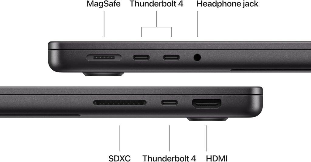 - Ports: MagSafe 3, 2x Thunderbolt 4, HDMI, headphone jack, SDXC